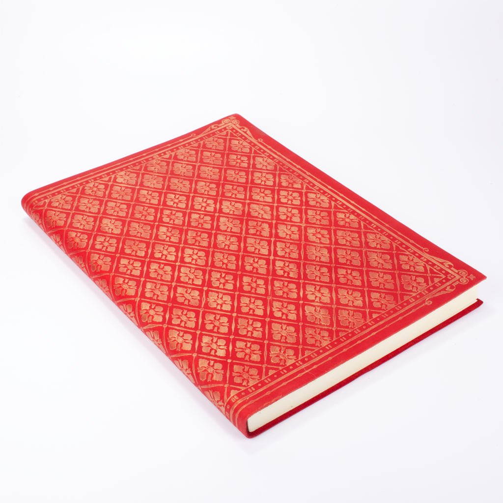 The flexible leather cover still has a soft, suede-like texture, but our new gilded version has its pattern burnished with a light gold sheen to gently catch the light and the eye.