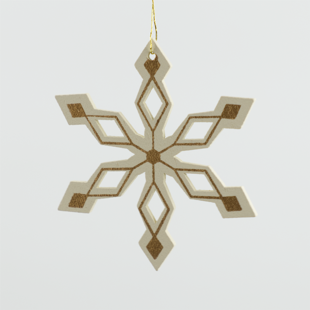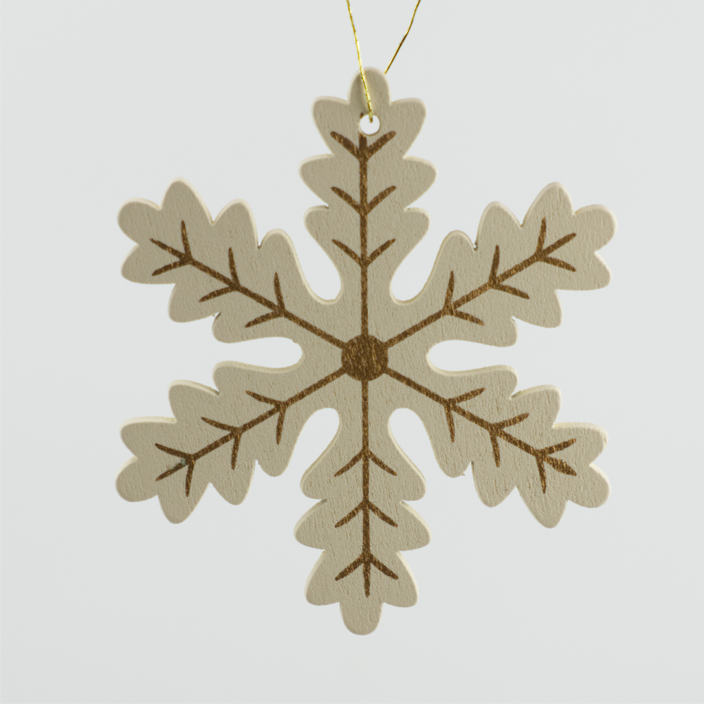 A box of twenty four elegant wooden snowflake decorations in three different designs.