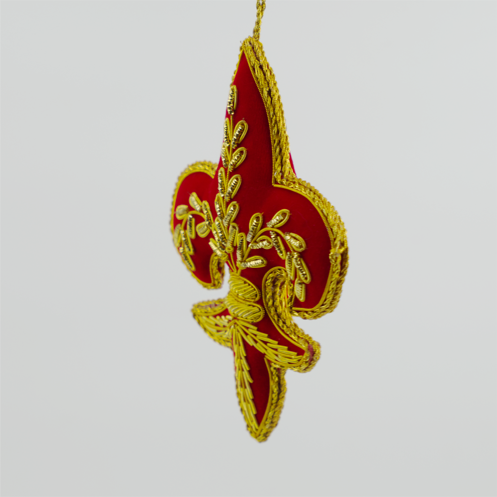 A classic Fleur de Lys hanging decoration. Made of luxurious padded velvet embroidered with gold thread. Decorated on both sides.