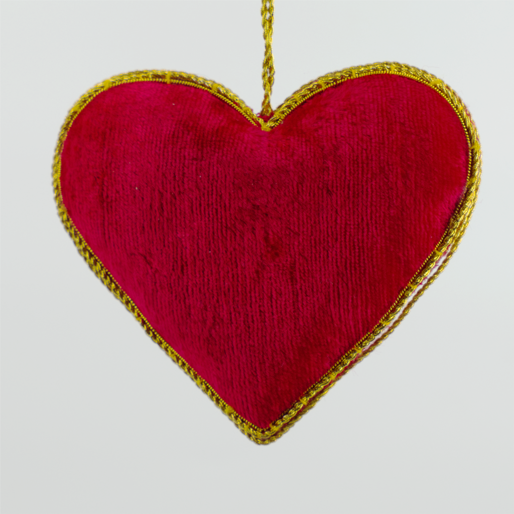 A classic heart motif hanging decoration. Made of luxurious padded velvet embroidered with gold thread. Decorated on one side.