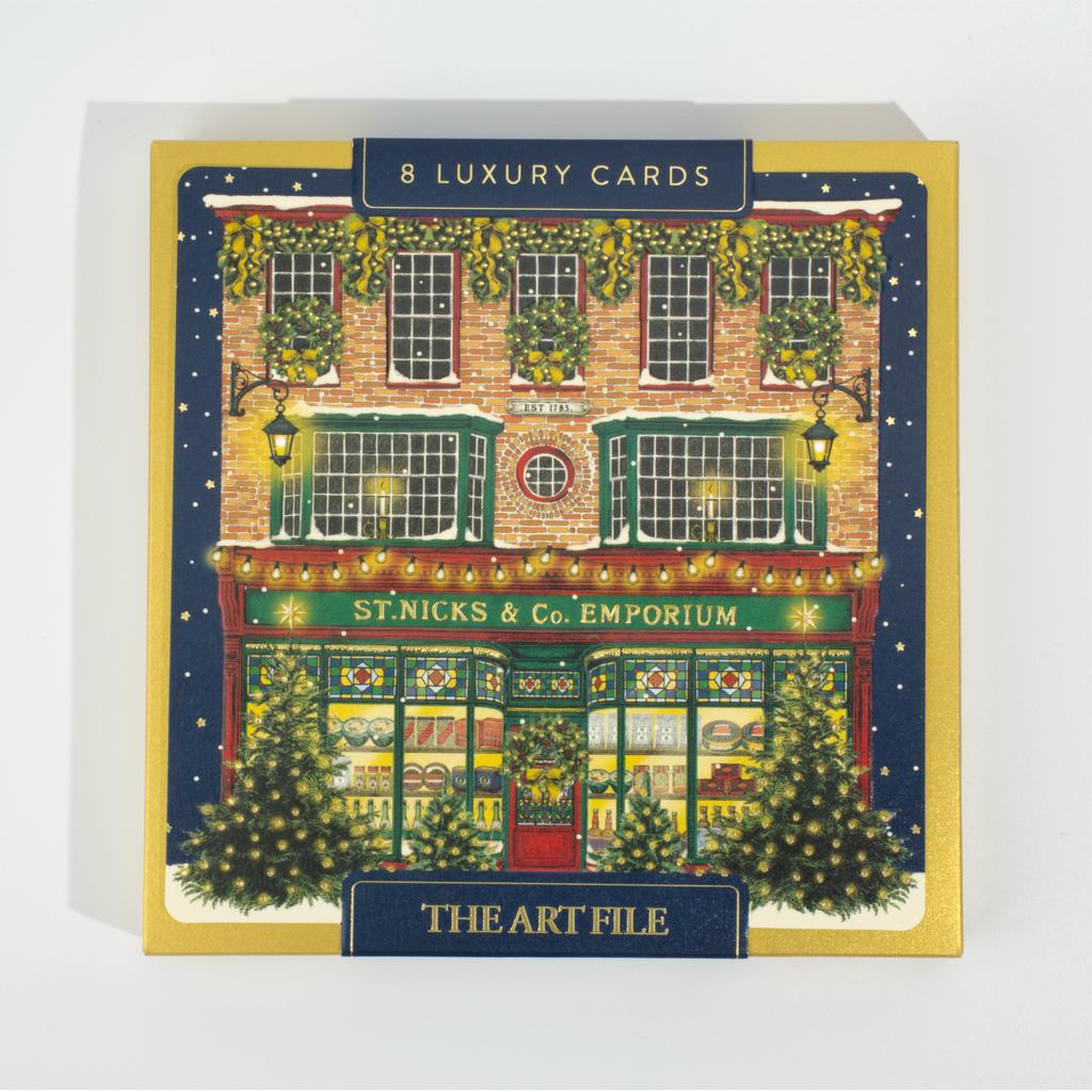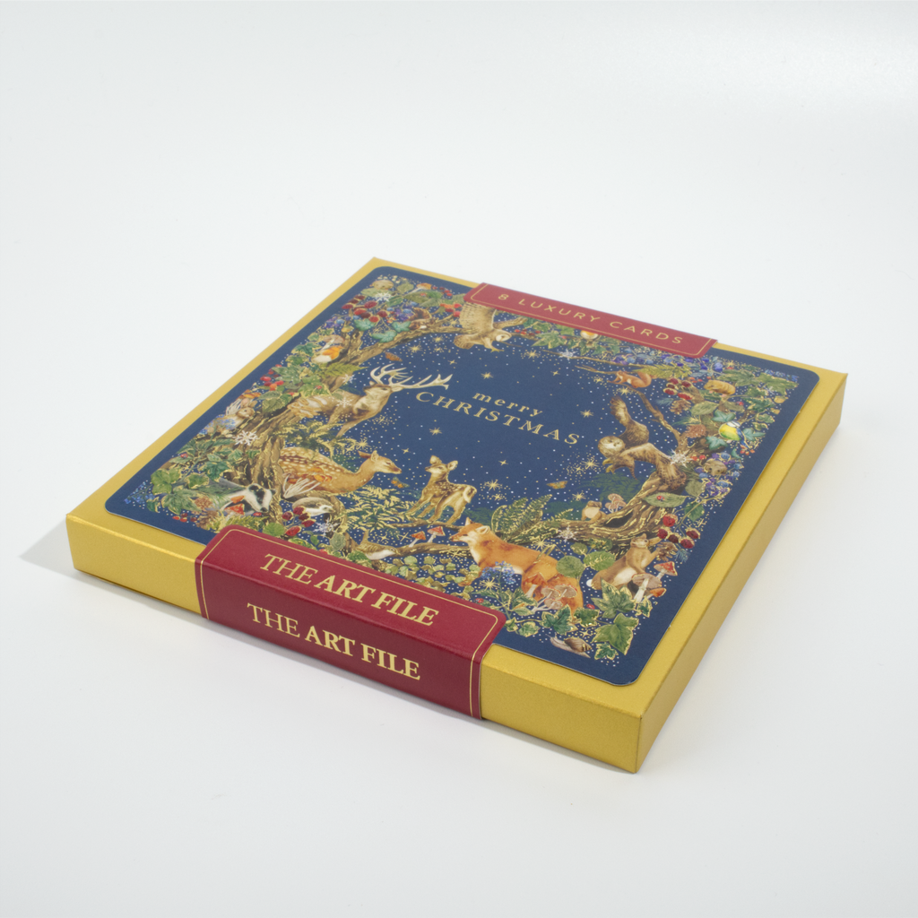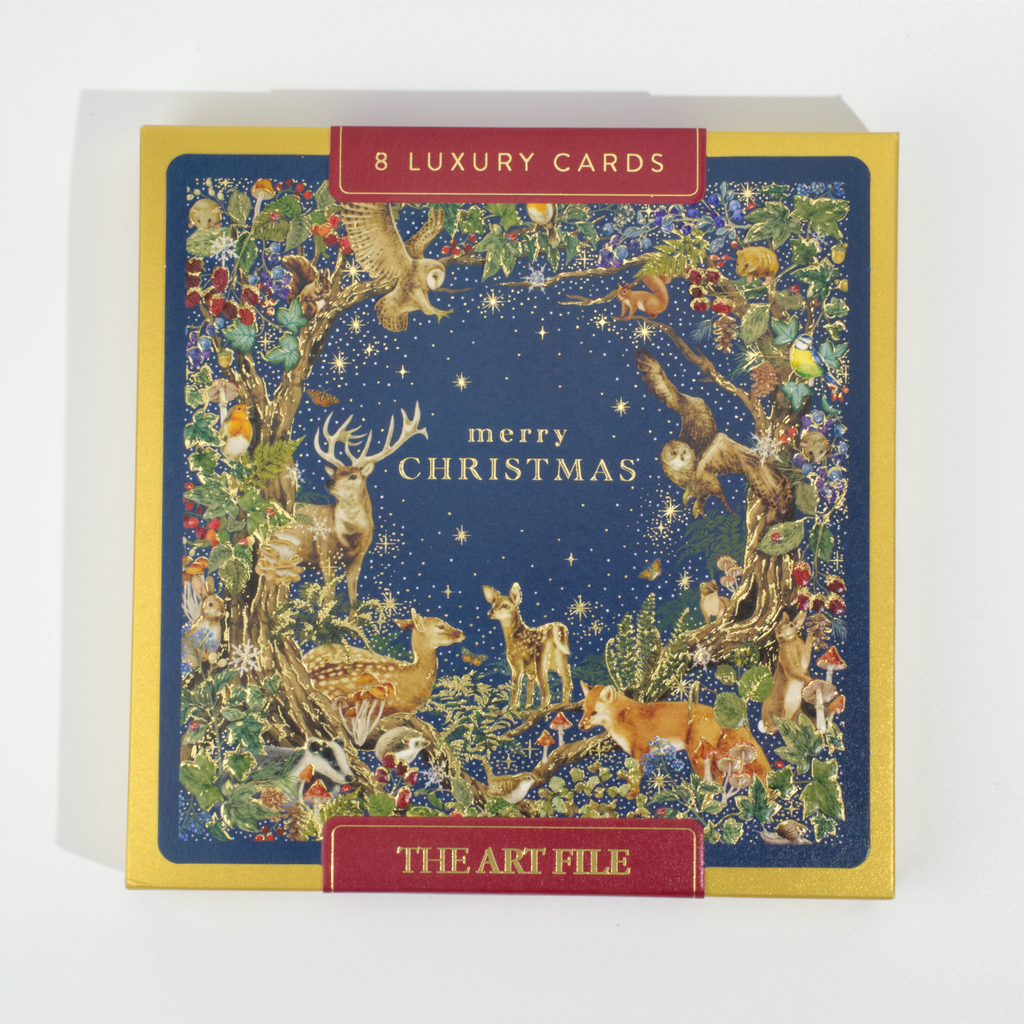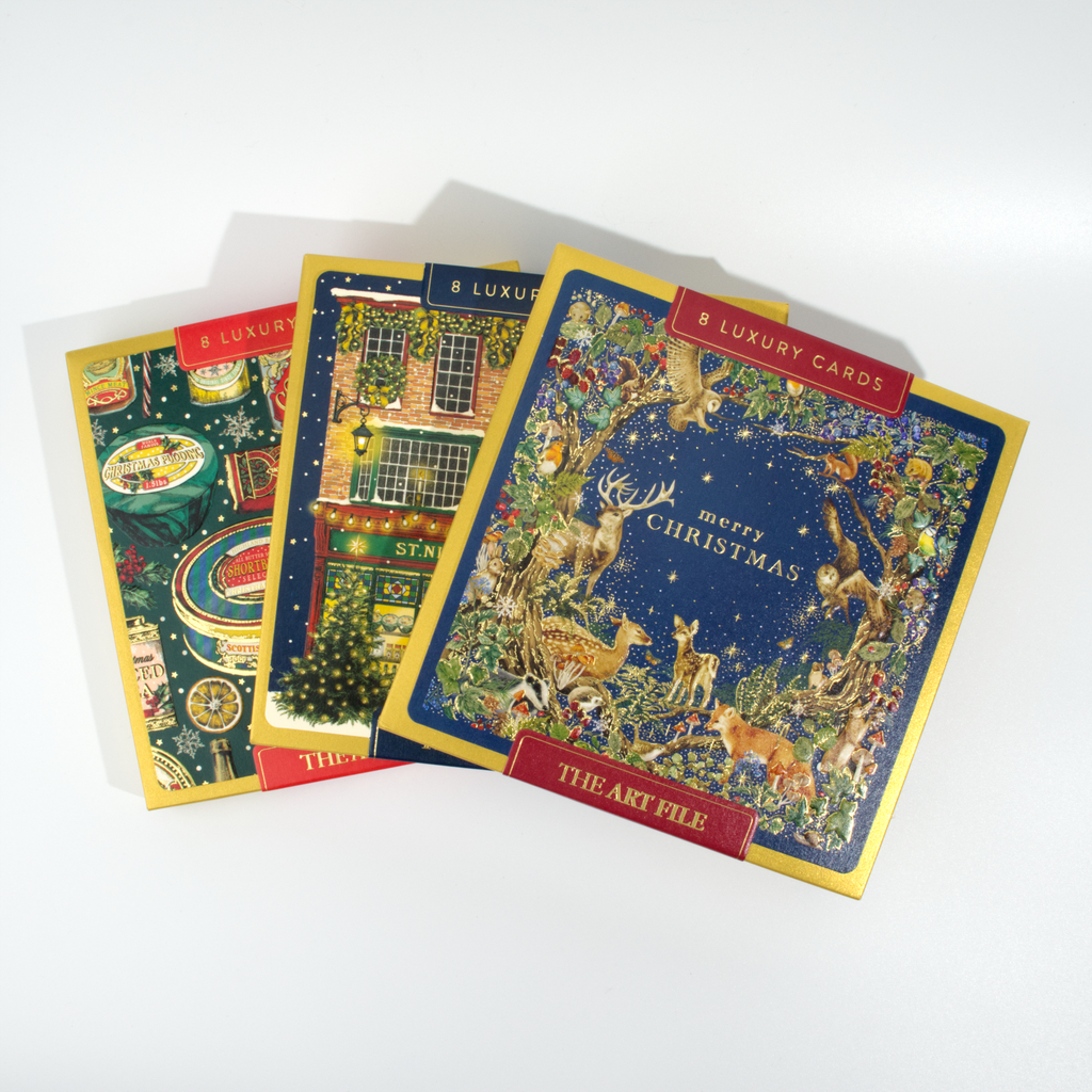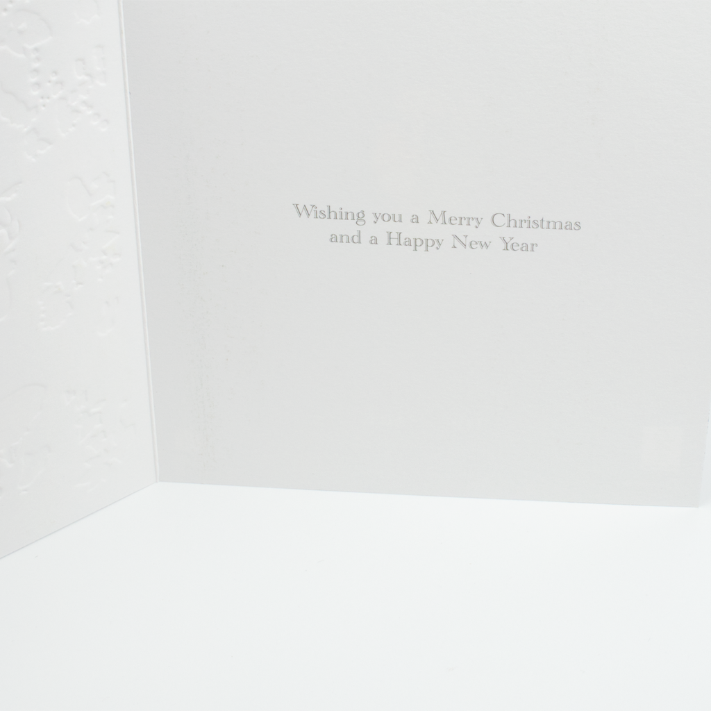 Eight luxurious Christmas cards with envelopes, featuring gold foil, emboss and deboss in three festive designs.
