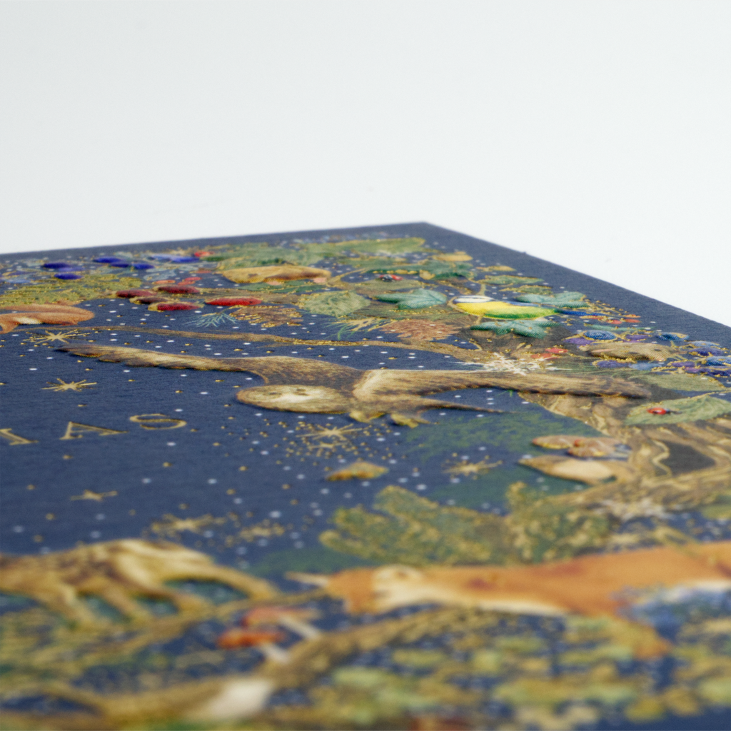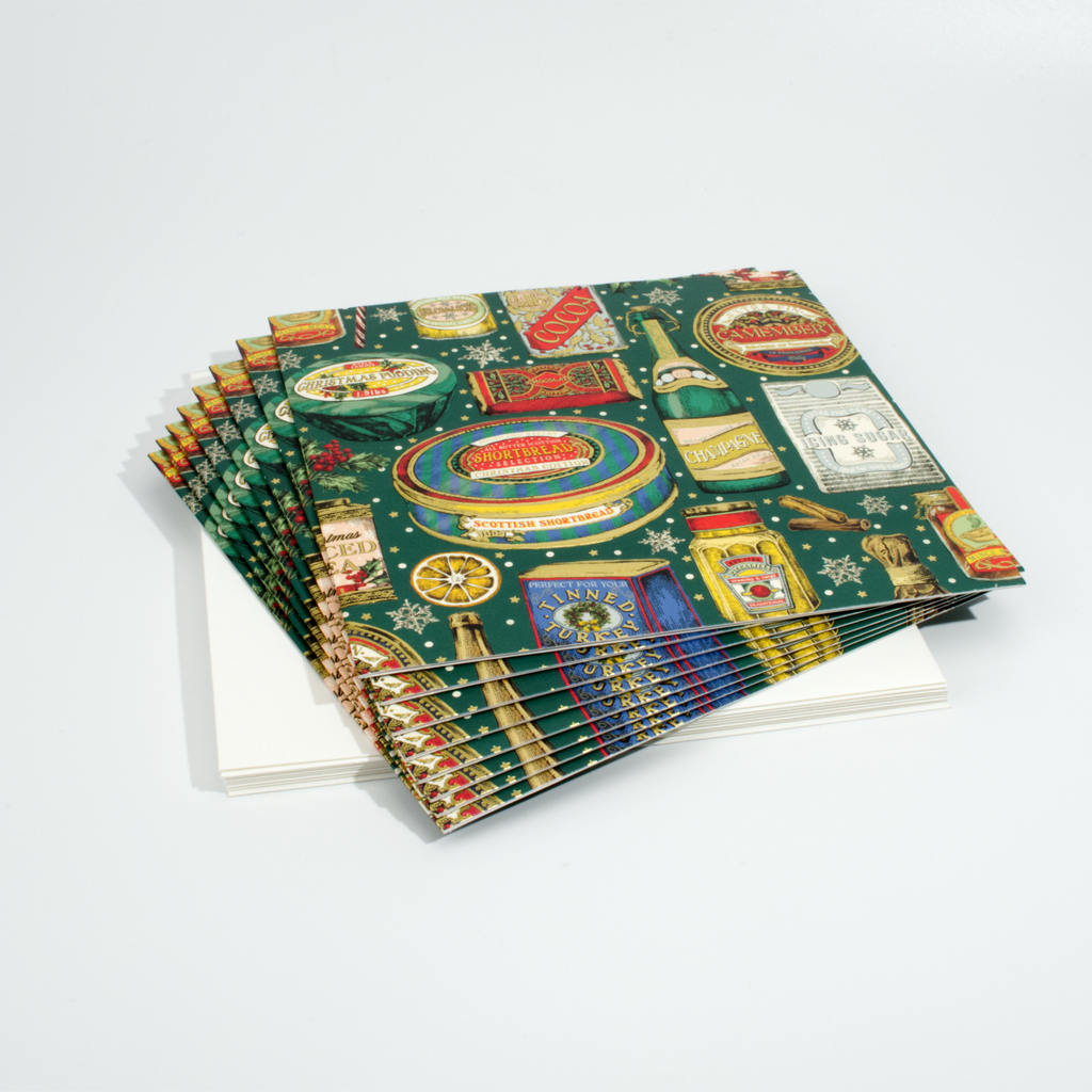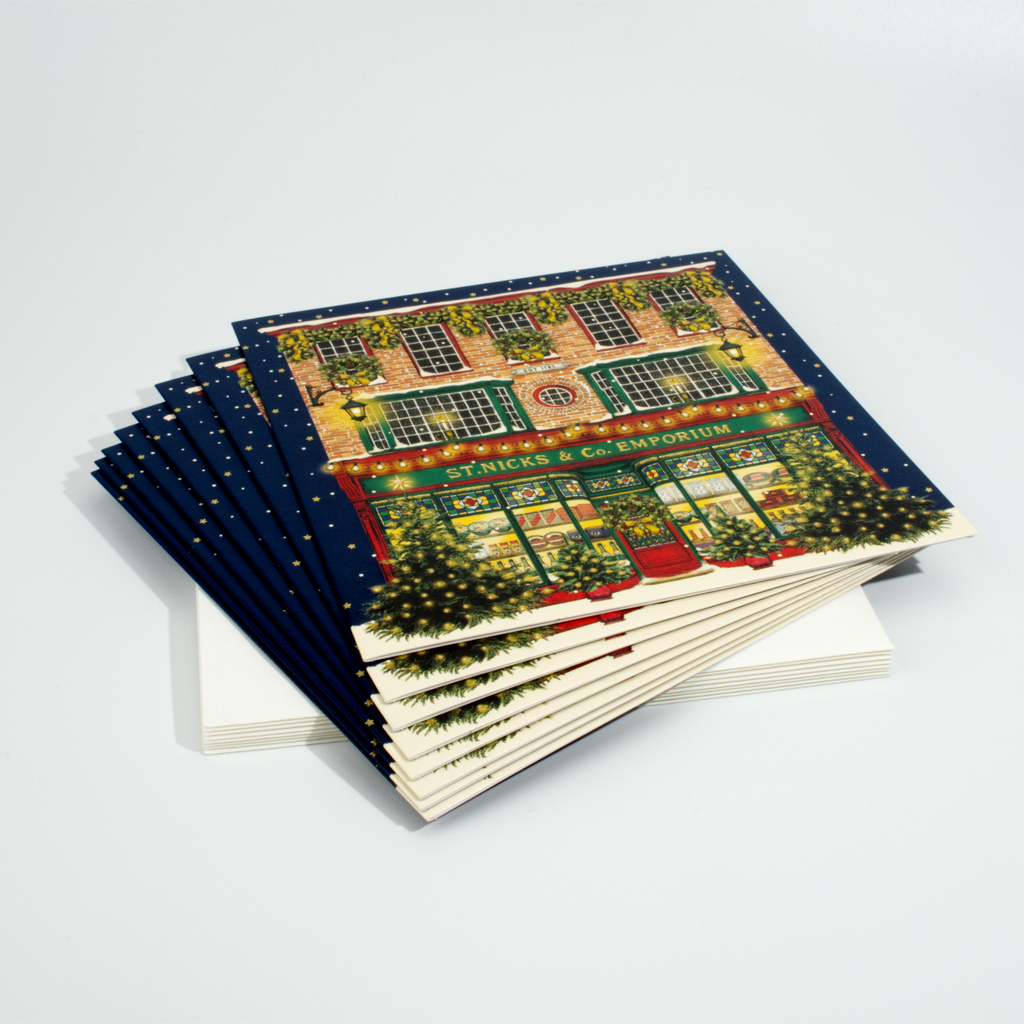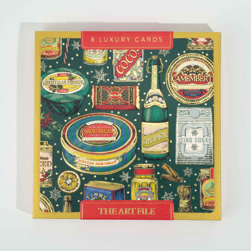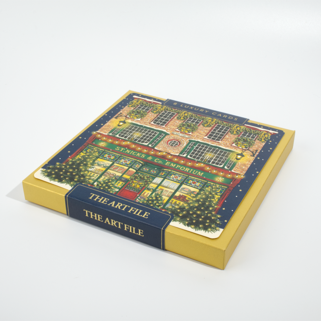 Eight luxurious Christmas cards with envelopes, featuring gold foil, emboss and deboss in three festive designs.