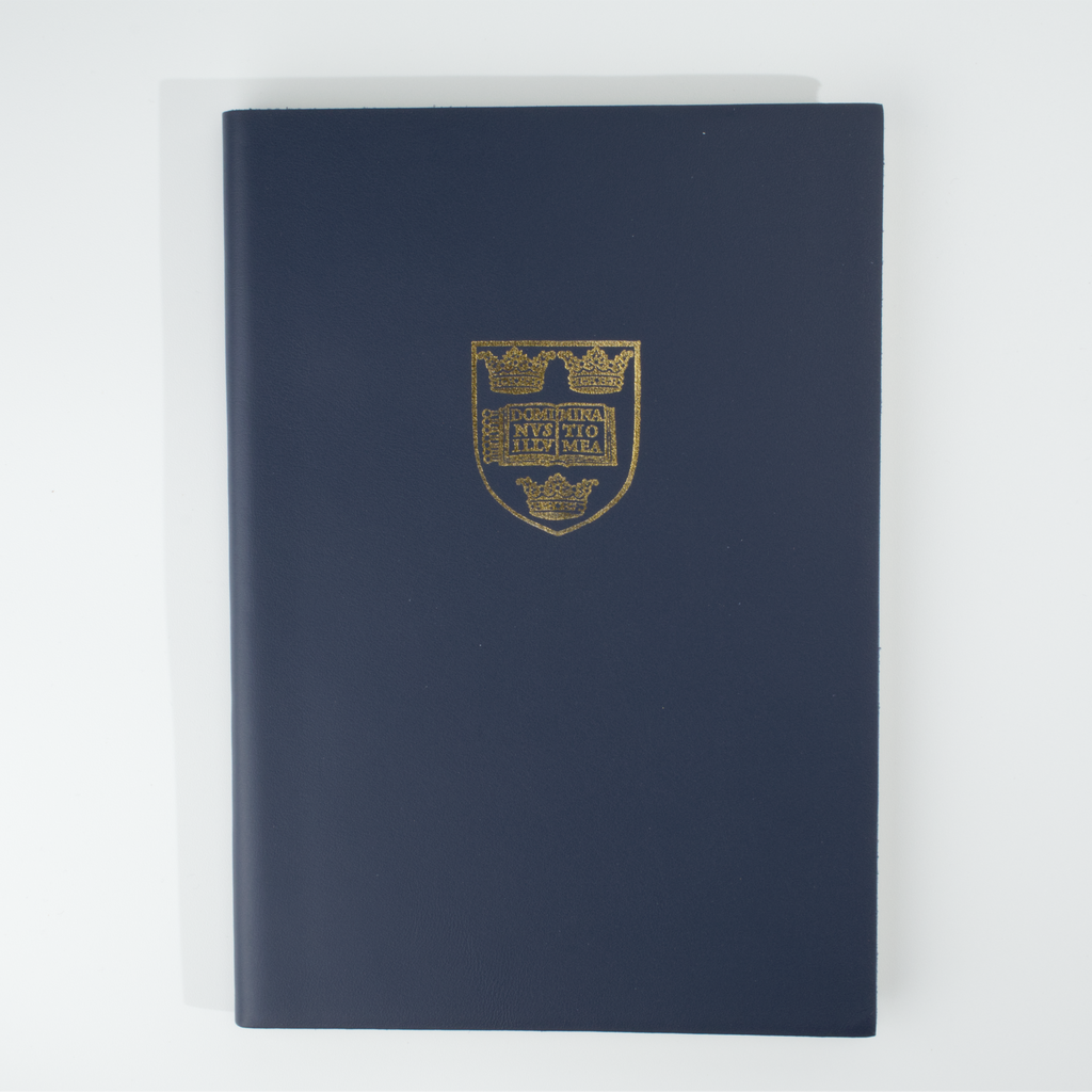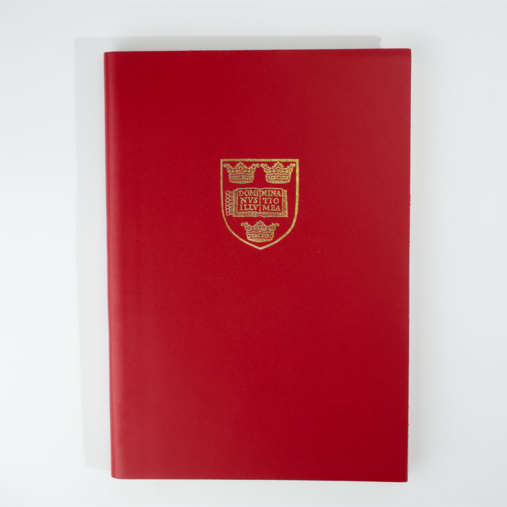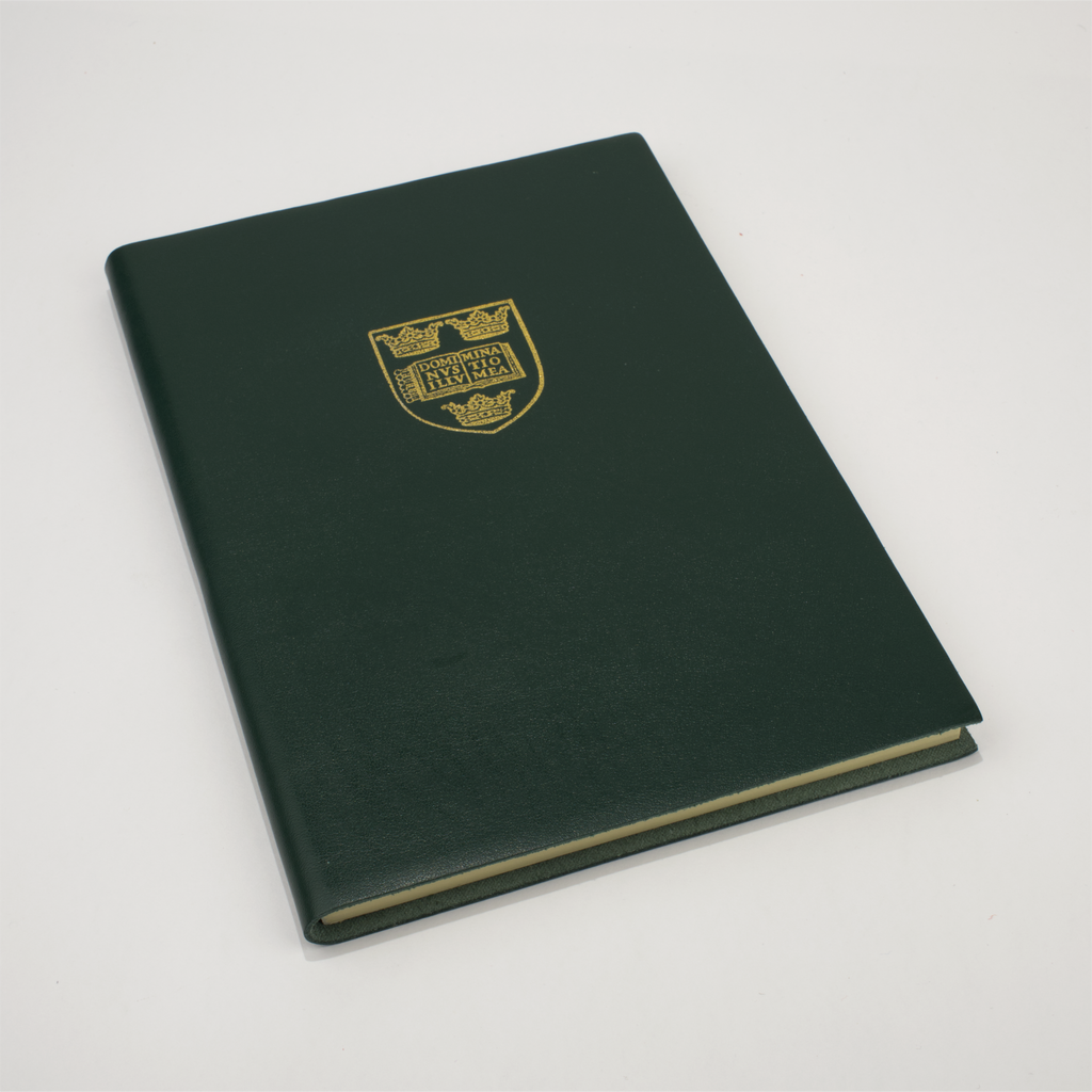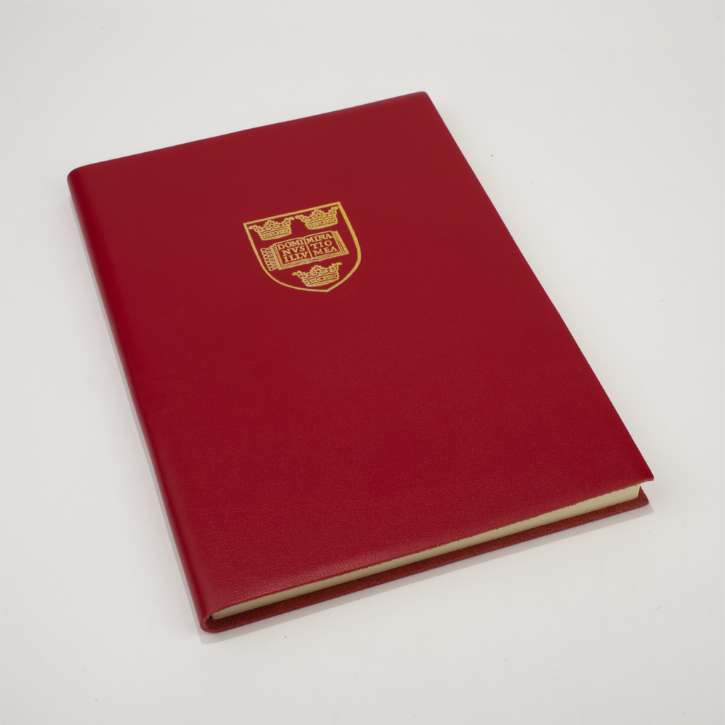 Leather-bound notebook in a choice of three colours with the Oxford University crest embossed in gold on the cover. Plain (blank) pages inside.