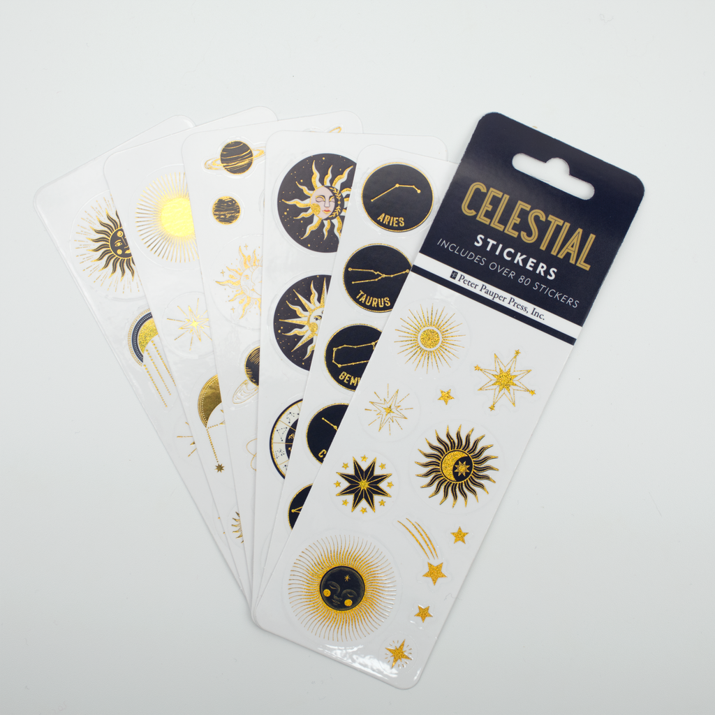 These eye catching celestial stickers feature varied designs showing the phenomena of the sky as they were seen through the ages. The stickers are shiny with glittering gold and silver highlights.